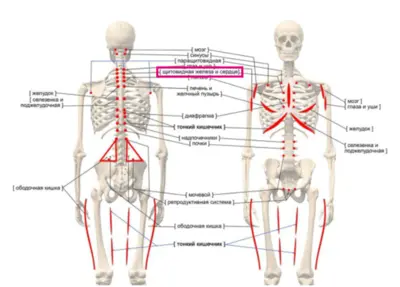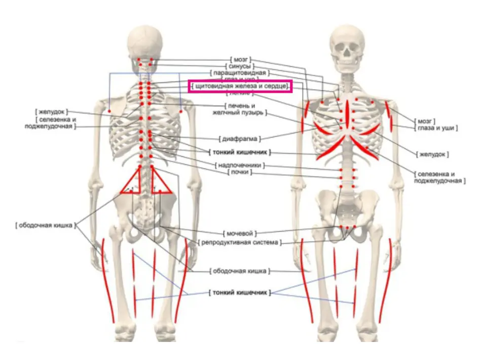 Главные “работники” щитовидной железы: Тироксин (Т4): Он отвечает за скорость нашего обмена веществ. Если его вырабатывается слишком мало, замедляется всё: энергия падает, вес растет, появляется сухость кожи и волос, человек чувствует себя разбитым. Если же его слишком много (гиперсекреция), то наоборот – учащается пульс, вес снижается, человек становится раздражительным, могут появиться специфические заболевания, как базедова болезнь. Трийодтиронин (Т3): Этот более активный гормон – главный регулятор энергетического обмена. Он как топливо для клеток, стимулирует распад энергии и ее доставку туда, где она наиболее нужна. Особенно важен для мозга – ускоряет его развитие у детей и поддерживает нервную деятельность у взрослых. Кальцитонин: Регулятор кальциево-фосфорного обмена. Имеет значение в диагностике некоторых онкологических процессов. Щитовидная железа состоит из двух долей, соединенных перешейком. Она обильно снабжена кровеносными сосудами, что обеспечивает гормонам быстрый доступ к органам и тканям. Связи в нашем теле, о которых вы не знали.Вы могли не знать, но наше тело – это единая, невероятно сложная система. Щитовидная железа не работает в изоляции. Связь с эмоциями (опосредованная). Прямой связи между конкретными эмоциями и выработкой гормонов щитовидной железы нет. Однако, имеется опосредованное влияние через нашу энергетическую систему, в том числе через так называемый “тройной обогреватель” (термин из восточной медицины, описывающий систему меридианов и связанных с ними органов). Если страдают органы, связанные с верхним отделом “тройного обогревателя” (например, легкие, на которые влияют грусть, надменность, или сердце, на которое влияет любовь), это может косвенно отразиться и на работе щитовидной железы. Постоянный стресс, тревога, невысказанные эмоции – прямой путь к дисбалансу ее работы. Связь с сосудистой и лимфатической системами. Эти связи формируются еще во внутриутробном развитии и сохраняются на протяжении жизни. Простыми словами: если орган (в данном случае щитовидка) недополучает питание или недостаточно хорошо очищается, это может проявляться болезненностью или определенным дискомфортом в зонах, связанных с этим органом. И наоборот, проблемы в этих зонах могут сигнализировать о неполадках в самой железе. Нейролимфатический рефлекс. Связывает нервную систему с лимфатической. Нарушения в щитовидке могут влиять на лимфоток в определенных зонах, а стимуляция этих зон (легким надавливанием) может улучшить отток и косвенно повлиять на железу. Нейрососудистый рефлекс. Связывает нервную систему с кровотоком. Помогает регулировать приток крови и питательных веществ к органам. Нейролимфатический рефлекс и Нейрососудистый рефлекс – это важные механизмы, которые позволяют телу сигнализировать о проблемах. Надавливая на определенные точки, мы можем активировать эти рефлексы, улучшить кровообращение и лимфоток, что косвенно помогает нормализовать работу щитовидной железы. Попробуйте найти эти точки на голове и на теле, где при легком надавливании вы почувствуете усиление пульсации. Удерживайте такое положение пальца около 20 секунд. Это может дать временное ощущение облегчения и показать, что тело реагирует. Висцеро-моторные связи (мышца-орган). У каждого органа есть свои “мышцы-партне