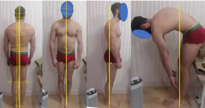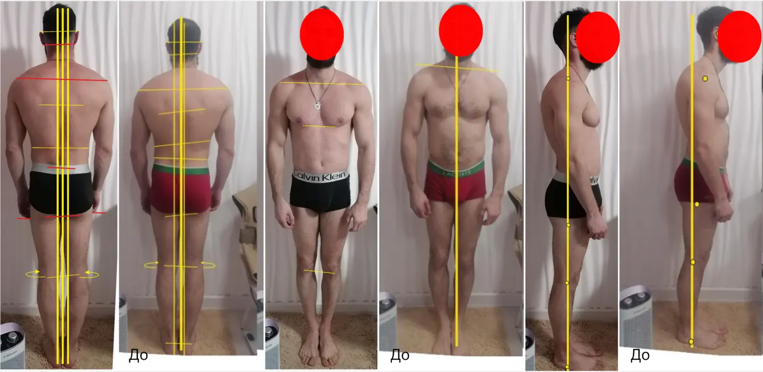 - Колени ротированы внутрь, гиперэкстензия (больше слева) + уплощение стопы с Халлюсом Вальгусом говорят о нарушениях глубинной фронтальной цепи по Т.Майерсу. Может говорить о хроническом психоэмоциональном напряжении.