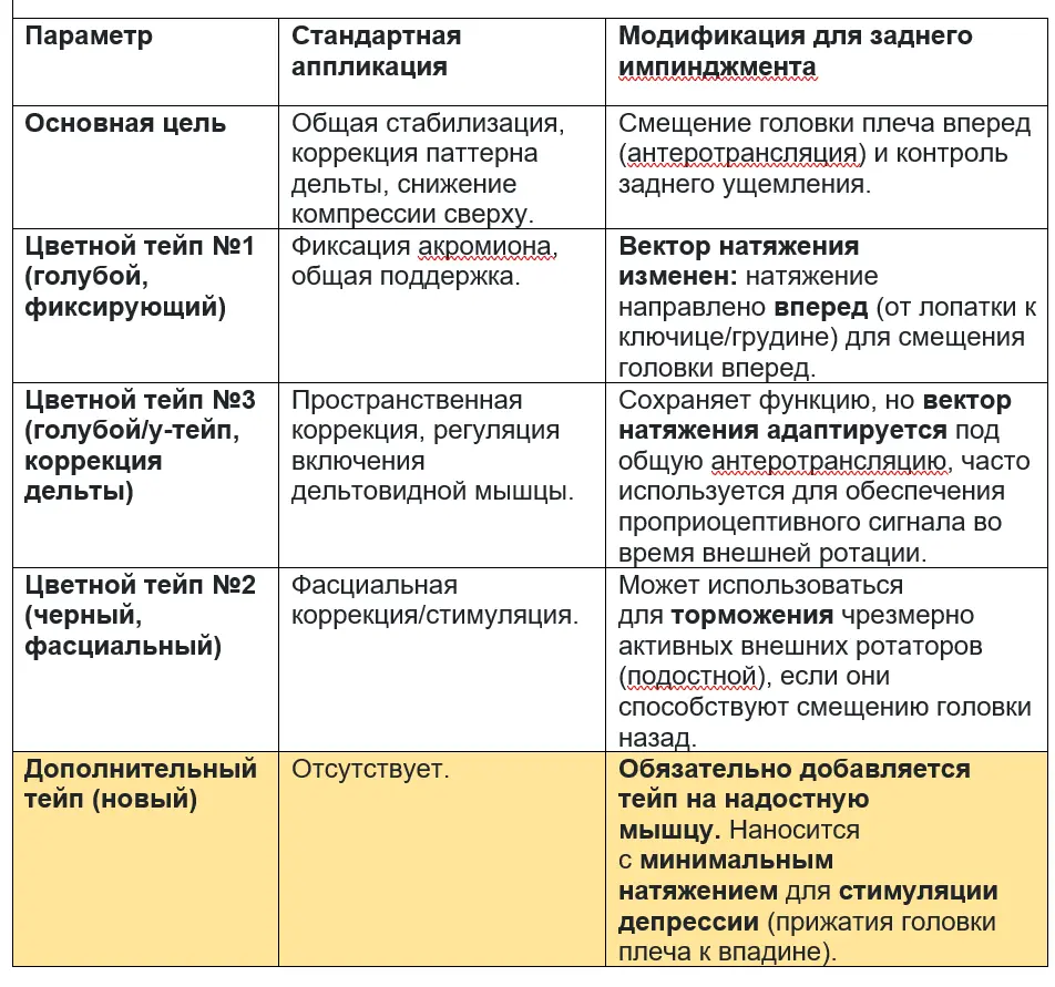 Интересный вопрос задал коллега под одним из постов про тейпирование. Передний/Нижний импинджмент Механика: неправильное вертикальное смещение (подъем) головки плечевой кости вверх при абдукции из-за дисфункции мышц (слабость надостной, гиперактивация дельтовидной, дискинезия лопатки). Это приводит к трению о нижнюю часть акромиона. Аппликация как раз для этого варианта самый сок. Механика: сдавление сухожилий (часто подостной и надостной) между задним краем акромиона и задне-верхней частью головки плечевой кости. Возникает при максимальной наружной ротации и отведении (позиция броска). В этом случае потребуется модификация. А какая смотрите в сравнительной таблице. | |